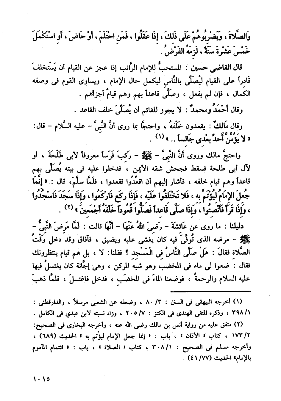 وقال مالك: يقعدون خلفه، واحتجا بما روي أن النبي -عليه السلام- قال: «لا يؤمن أحد بعدي جالسًا».