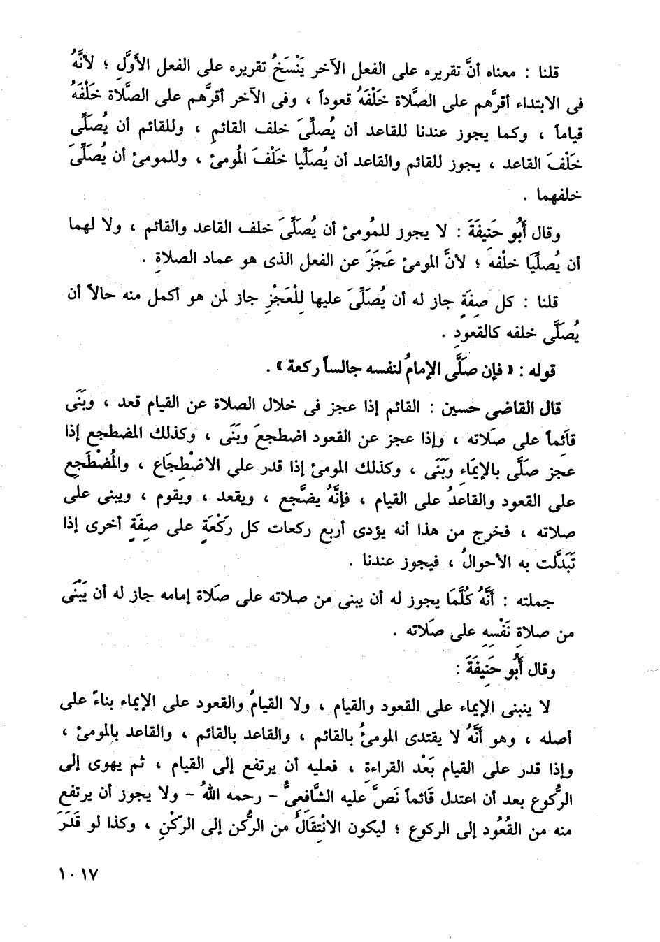 قلنا: معناه أن تقريره على الفعل الآخر ينسخ تقريره على الفعل الأول، لأنه في الابتداء أقرهم على الصلاة خلفه قعودًا، وفي الآخر أقرهم على الصلاة خلفه قيامًا، وكما يجوز عندنا للقاعد أن يصلي خلف القائم، وللقائم أن يصلي خلف القاعد، يجوز للقائم والقاعد أن يصلي خلف المومئ، وللمومئ أن يصلي خلفهما.