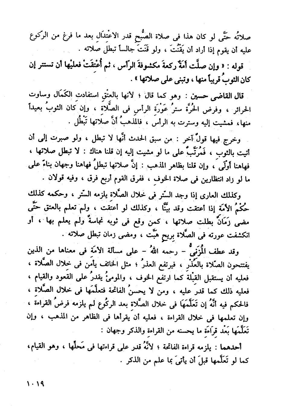 وقد عطف المزني، رحمه الله على مسألة الأمة في معناها من الذين يفتتحون الصلاة بالعذر، فيرتفع العذر، مثل الخائف يأمن في خلال الصلاة فعليه أن يستقبل القبلة كما ارتفع الخوف، والموميء يقدر على القعود والقيام فعليه ذلك كما قدر عليه، ومن لا يحسن الفاتحة فتعلمها في خلال الصلاة فالحكم فيه أنه إن تعلمها في خلال الصلاة بعد الركوع لم يلزمه فرض القراءة، وإن تعلمها في خلال القراءة، فعليه أن يقرأها في الظاهر من المذهب، وإن تعلمها بعد قراءة ما يحسنه من القراءة والذكر وجهان: