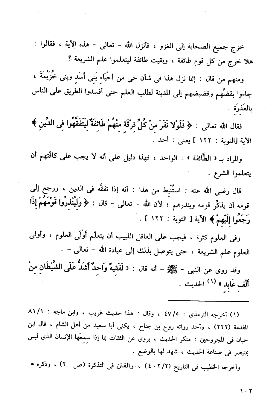 فقال الله تعالى: (فولا نفر من كل فرقة منهم طائفة ليتفقهوا في الدين) الآية، يعني: أحد.