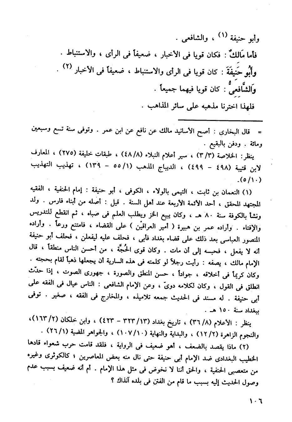 وأبو حنيفة: كان قويًا في الرأي والاستنباط، ضعيفًا في الأخبار.