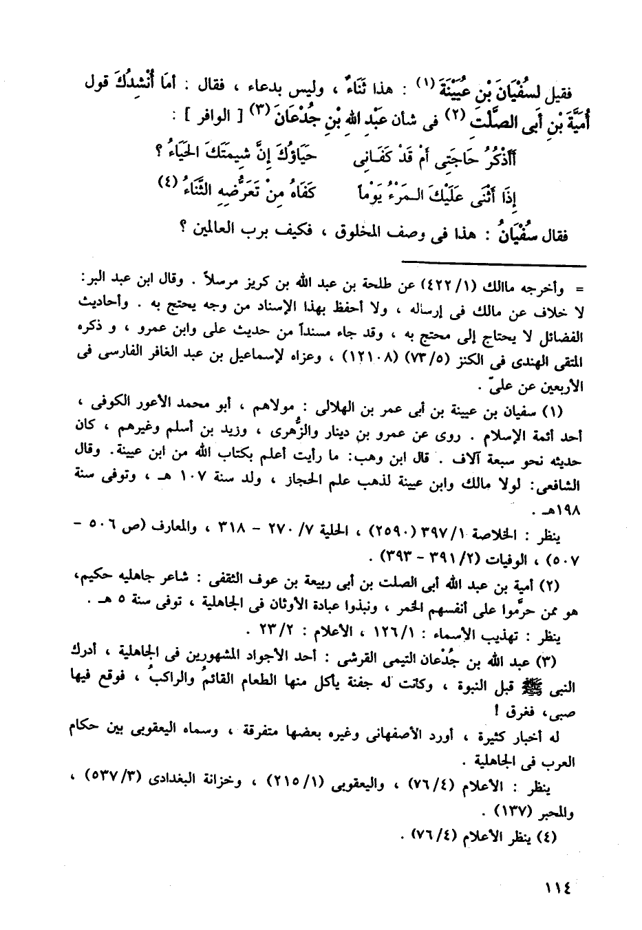فقيل لسفيان بن عيينة، هذا ثناء، وليس بدعاء، فقال: أما أنشدك قول أمية بن أبي الصلت، في شأن عبد الله بن جدعان،