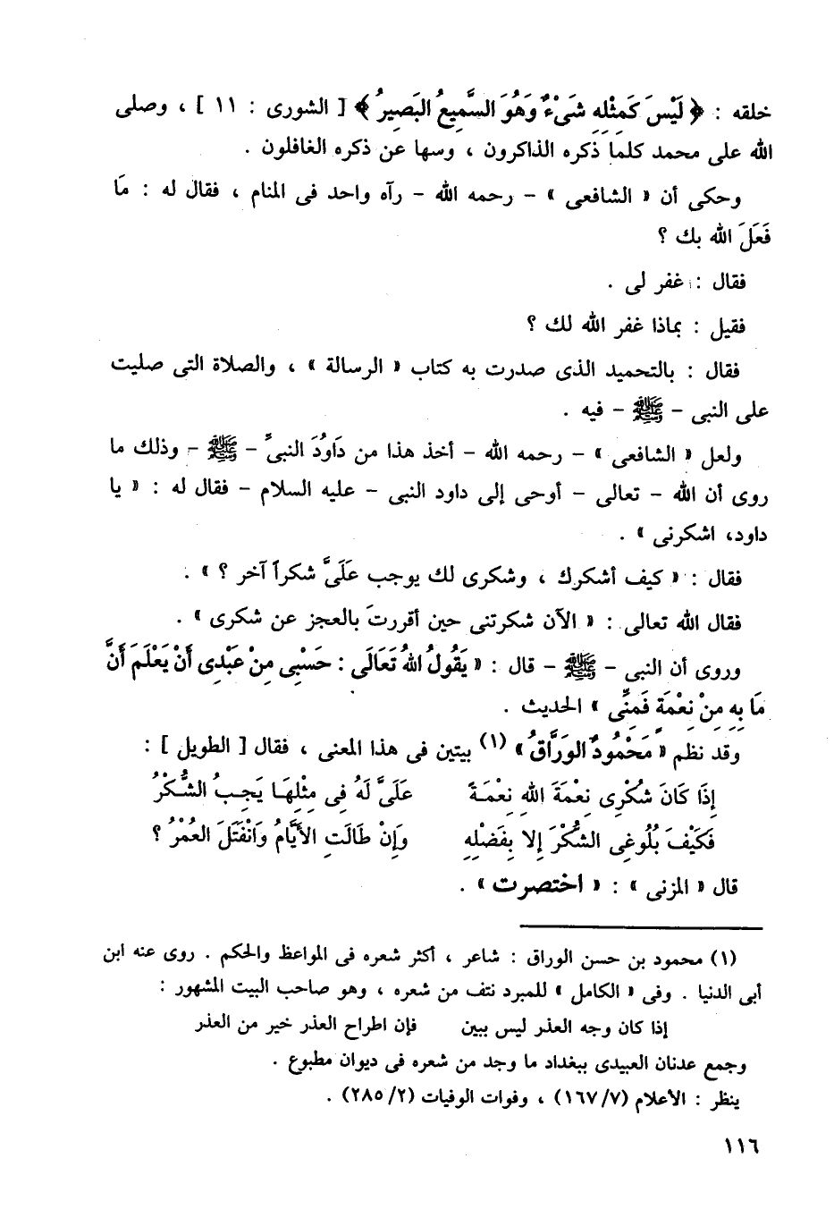ولعل الشافعي رحمه الله أخذ هذا من داود النبي صلى الله عليه وسلم وذلك ما روى أن الله تعالى أوحى إلى داود النبي عليه السلام فقال له: يا داود اشكرني.