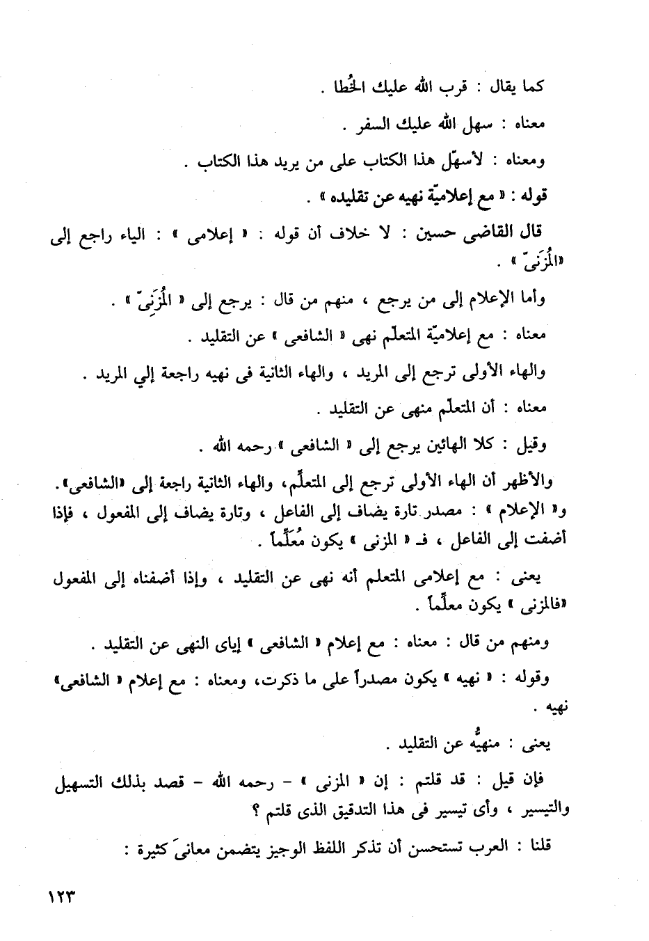 يعني مع إعلامي المتعلم أنه نهي عن التقليد، وإذا أضفناه إلى المفعول فالمزني يكون معلما.