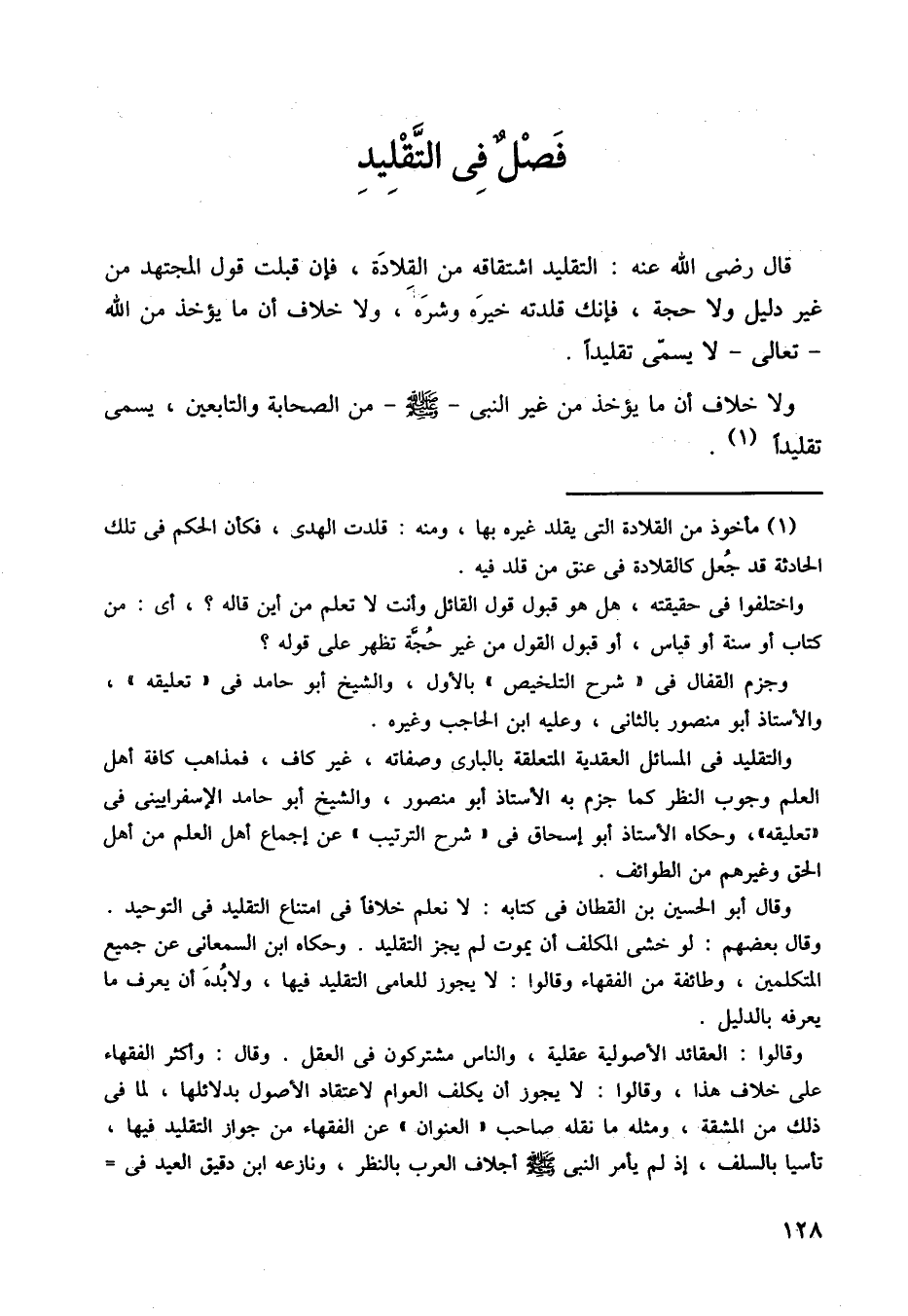 قال رضي الله عنه: التقليد اشتقاقه من القلادة، فإن قبلت قول المجتهد من غير دليل ولا حجة، فإنك قلدته خيره وشره، ولا خلاف أن ما يؤخذ من الله تعالى لا يسمى تقليدًا.