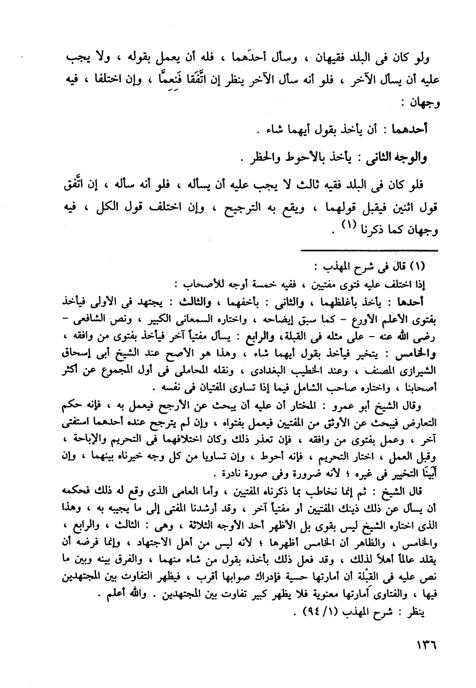 ولو كان في البلد فقيهان، وسأل أحدهما، فله أن يعمل بقوله: ولا يجب عليه أن يسأل الآخر، فلو أنه سأل الآخر ينظر أن اتفقا فنعما، وإن اختلفا، فيه وجهان: