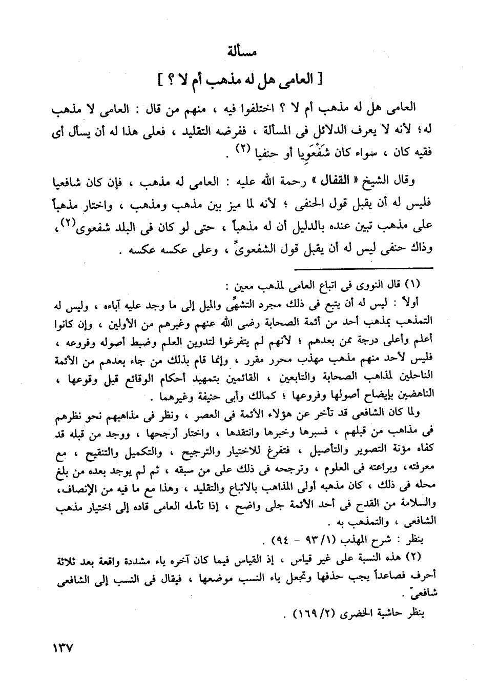 العامي هل له مذهب أم لا؟ اختلفوا فيه، منهم من قال: العامي لا مذهب له، لأنه لا يعرف الدلائل في المسألة، ففرضه التقليد، فعلى هذا له أن يسأل أي فقيه كان سواء كان شفعويا أو حنفيا.