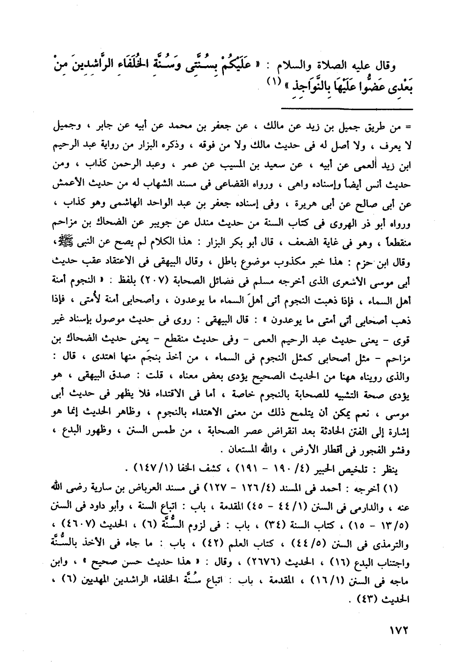 وقال عليه الصلاة والسلام: (عليكم بسنتي وسنة الخلفاء الراشدين من بعدي عضوا عليها بالنواجذ).
