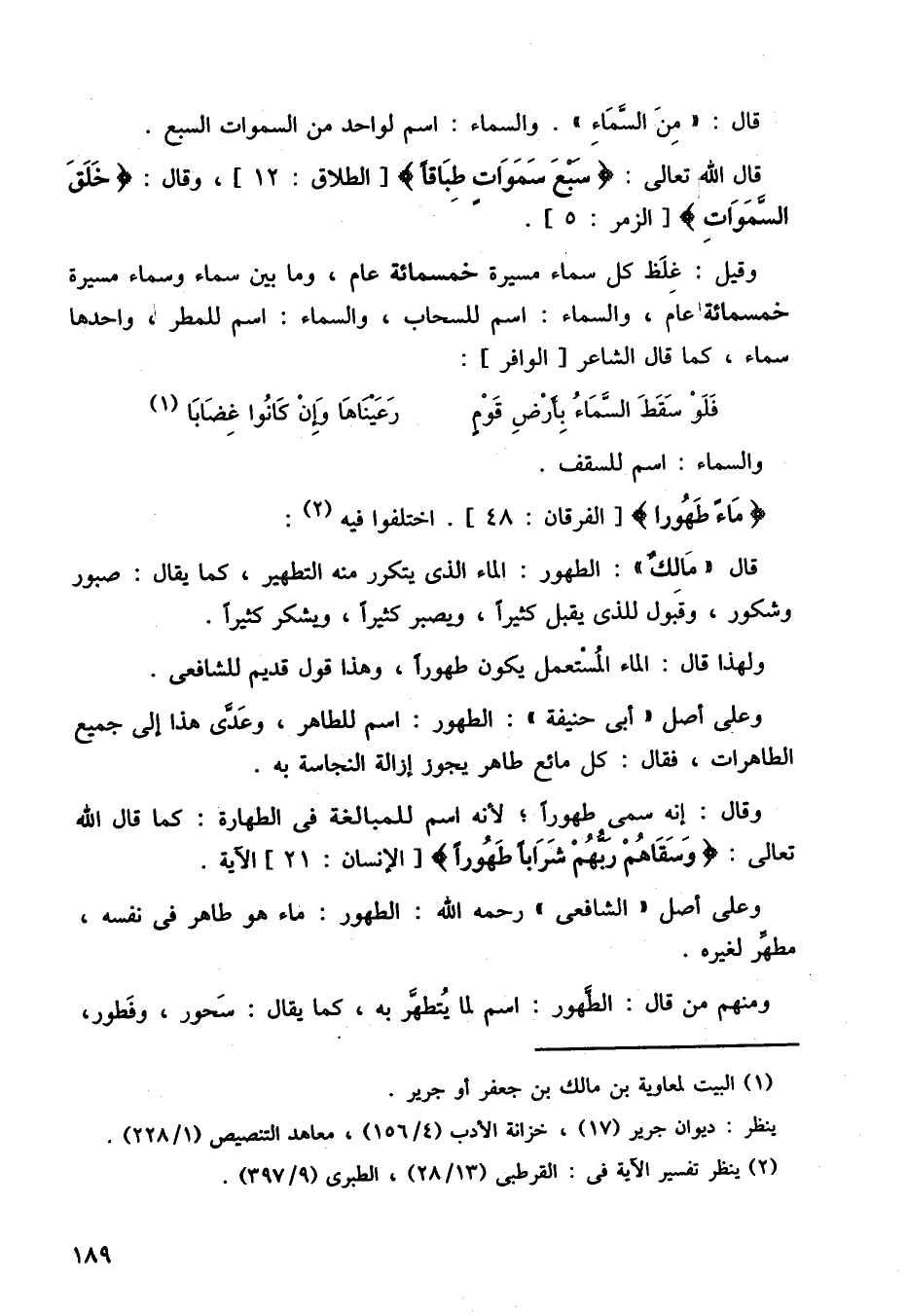 قال (مالك) الطهور: الماء الذي يتكرر منه التطهير، كما يقال: صبور وشكور، وقبول للذي يقبل كثيرًا، ويصبر كثيرًا، ويشكر كثيرًا.