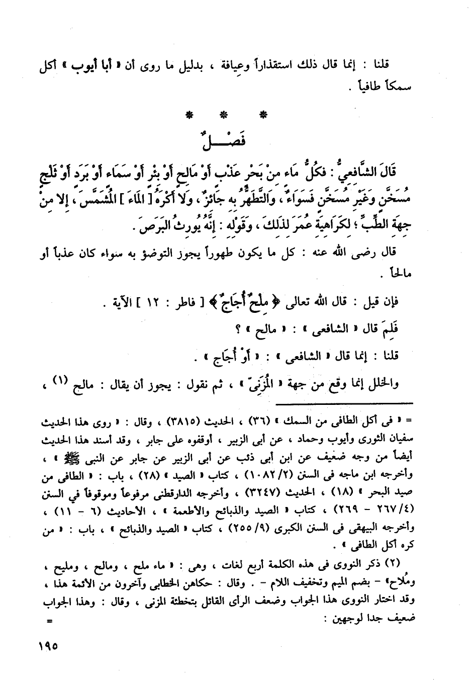 قال الشافعي: فكل ماء من بحر عذب أو مالح أو بئر أو سماء أو برد أو ثلج مسخن وغير مسخن فسواء، والتطهر به جائز، ولا أكره [الماء] المشمس، إلا من جهة الطب، لكراهية عمر لذلك، وقوله: إنه يورث البرص.