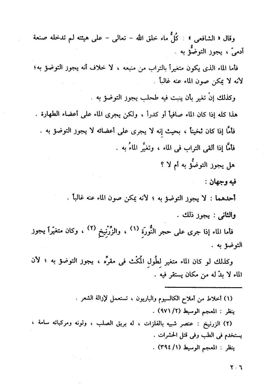 وقال الشافعي: كل ماء خلق الله تعالى على هيئته لم تدخله صنعة آدمي، يجوز التوضؤ به.
