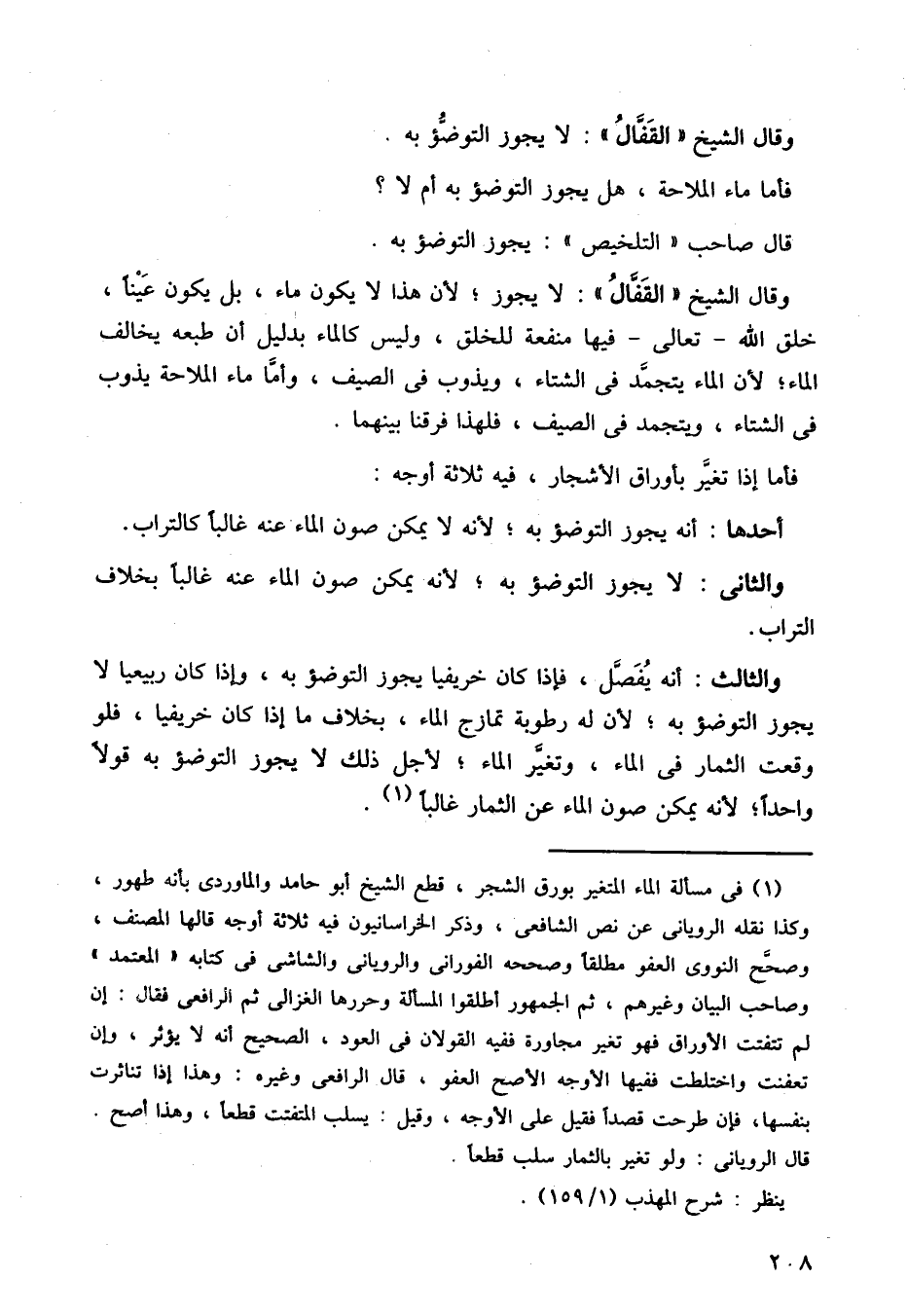 وقال الشيخ القفال، لا يجوز؛ لأن هذا لا يكون ماء، بل يكون عينًا، خلق الله تعالى، فيها منفعة للخلق، وليس كالماء بدليل أن طبعه يخالف الماء، لأن الماء يتجمد في الشتاء، ويذوب في الصيف، وأما ماء الملاحة يذوب في الشتاء، ويتجمد في الصيف، فلهذا فرقنا بينهما.