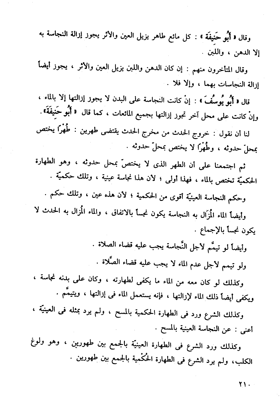 قال (أبو يوسف): إن كانت النجاسة على البدن لا يجوز إزالتها إلا بالماء، وإن كانت على محل آخر تجوز إزالتها بجميع المائعات، كما قال (أبو حنيفة) لنا أن نقول: خروج الحدث من مخرج الحدث يقتضي طهرين: طهرا يختص بمحل حدوثه، وطهرا لا يختص بمحل حدوثه.