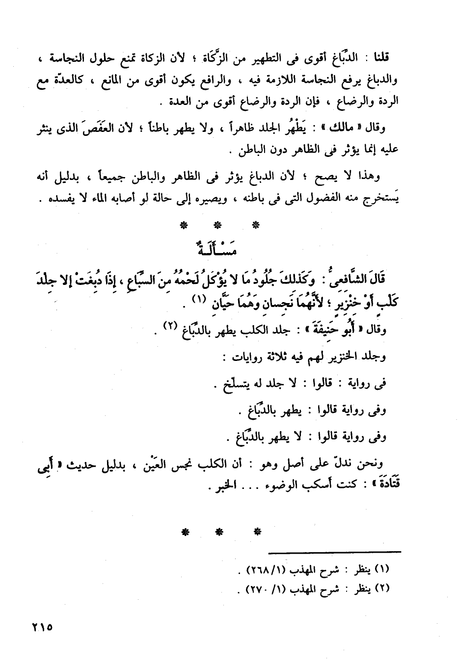 قلنا: الدباغ أقوي في التطهير من الزكاة، لأن الزكاة تمنع حلول النجاسة، والدباغ يرفع النجاسة اللازمة فيه، والرافع يكون أقوى من المانع، كالعدة مع الردة والرضاع، فإن الردة والرضاع أقوي من العدة.