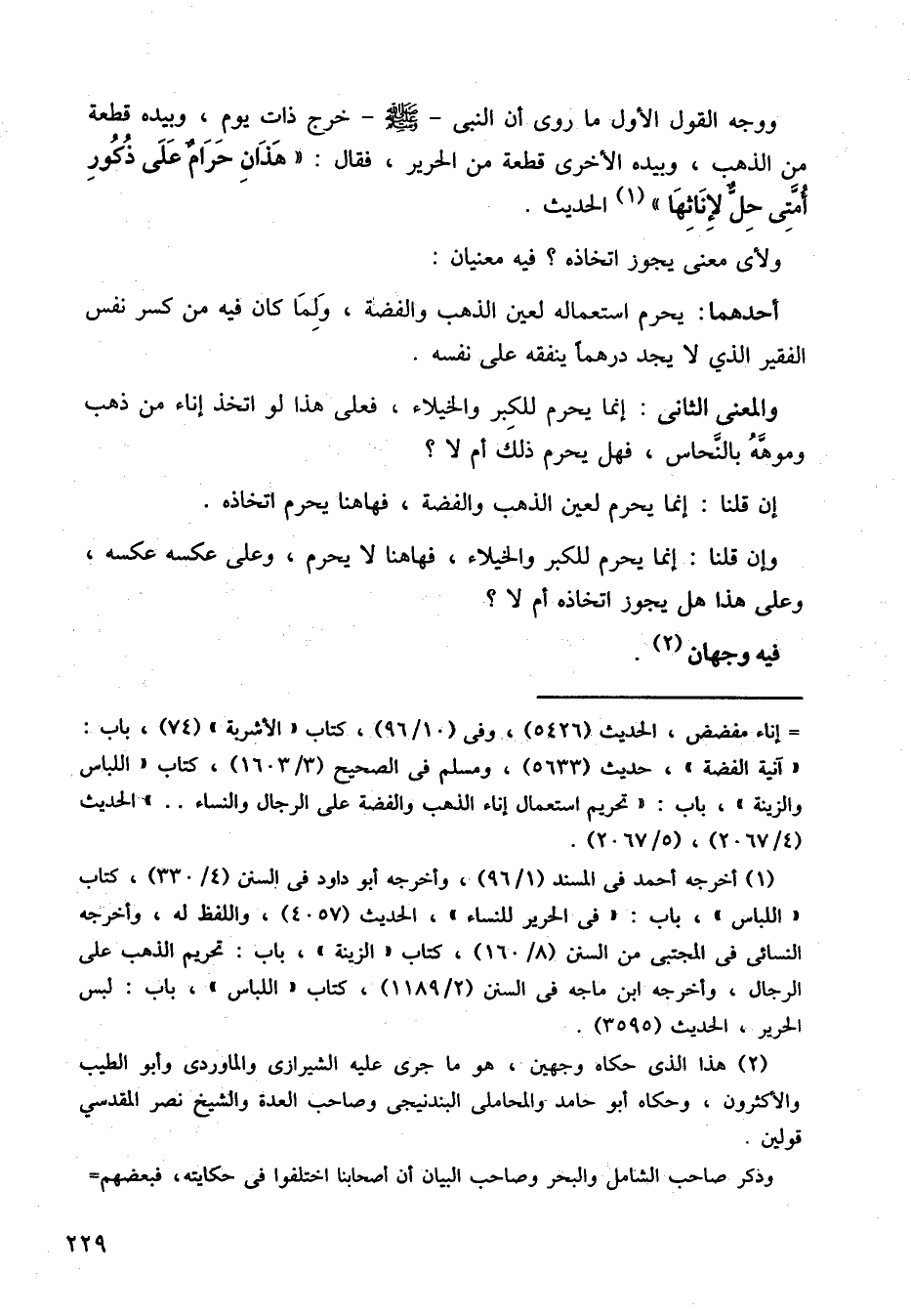 ووجه القول الأول ما روى أن النبي صلى الله عليه وسلم خرج ذات يوم، وبيده قطعة من الذهب، وبيده الأخرى قطعة من الحرير، فقال: هذان حرام على ذكور أمتي حلال لإناثها، الحديث.