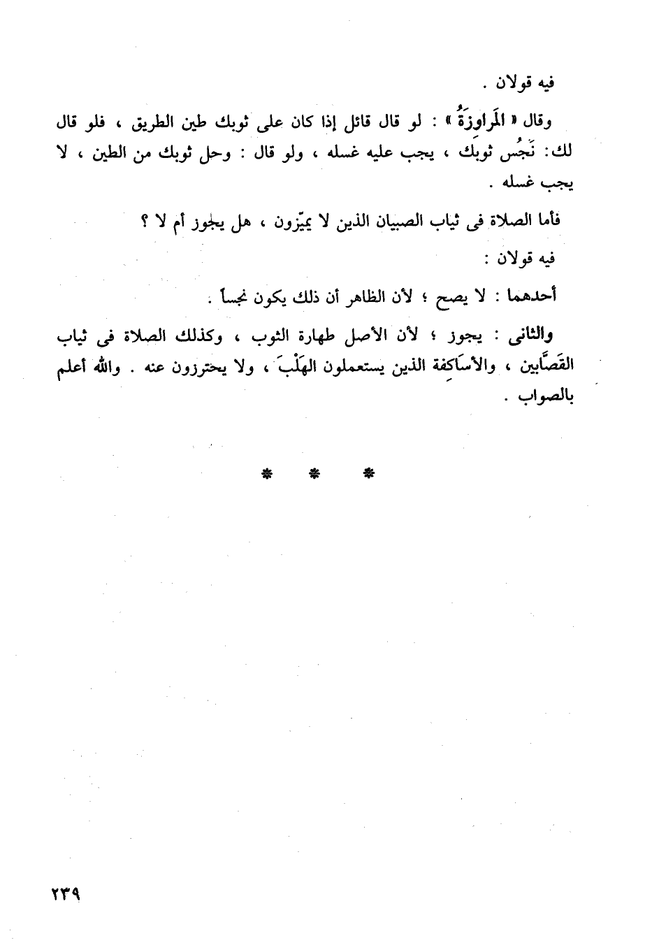 والثاني: يجوز، لأن الأصل طهارة الثوب، وكذلك الصلاة في ثياب القصابين، والأساكفة الذين يستعملون الهلب، ولا يحترزون عنه. والله أعلم، بالصواب.