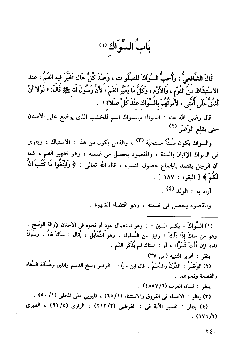 قال رضي الله عنه: السواك والمسواك اسم للخشب الذي يوضع على الأسنان حتى يقلع الوضر.