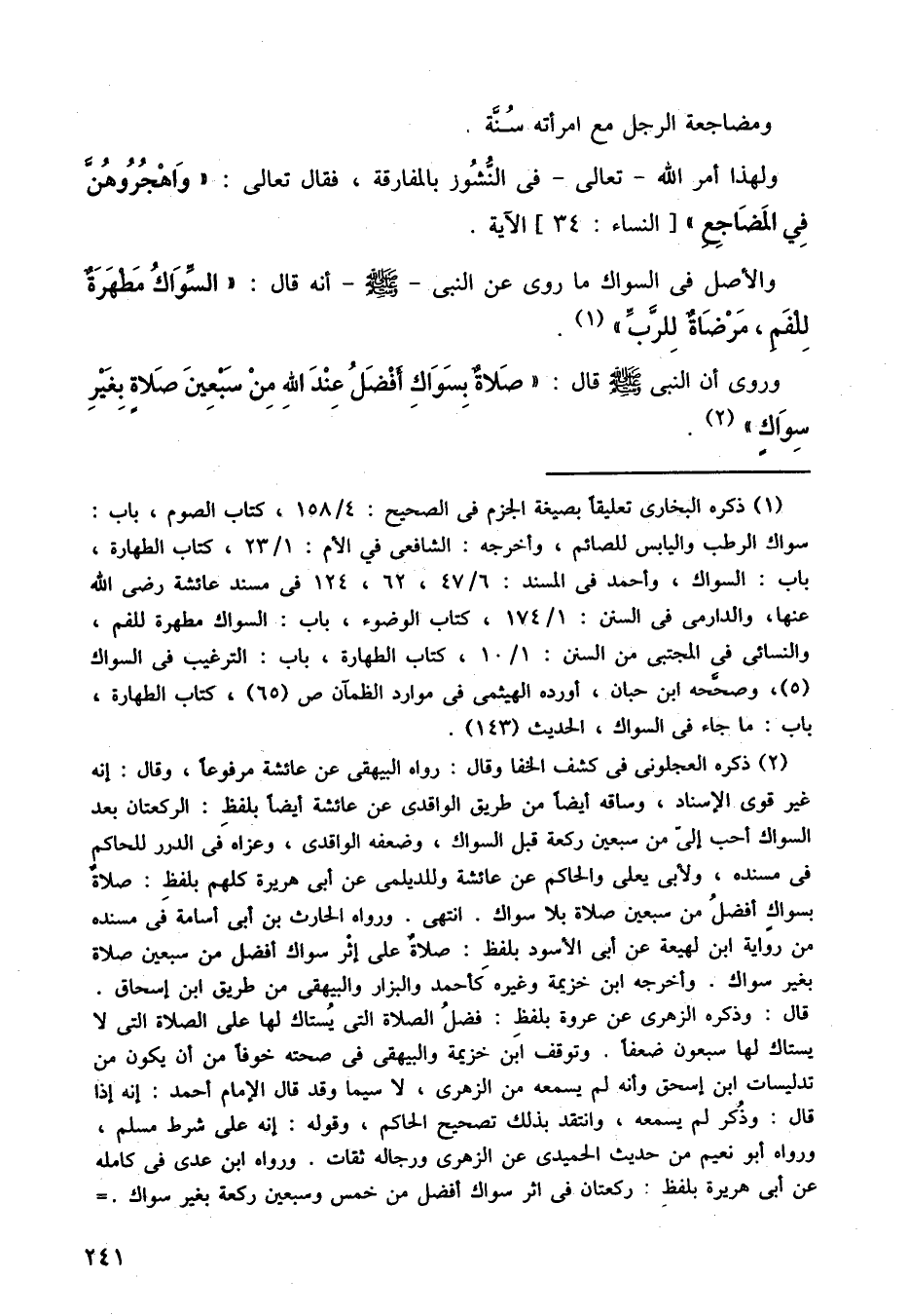 وروى أن النبي صلى الله عليه وسلم قال: صلاة بسواك أفضل عند الله من سبعين صلاة بغير سواك.