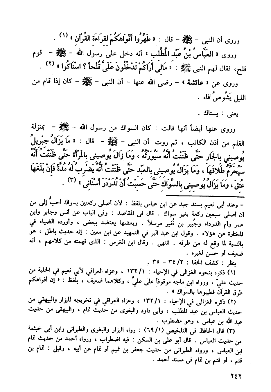 وروى العباس بن عبد المطلب، أنه دخل على رسول الله صلى الله عليه وسلم قوم قلح، فقال لهم النبي صلى الله عليه وسلم، مالي أراكم تدخلون على قلحا؟ استاكوا؟