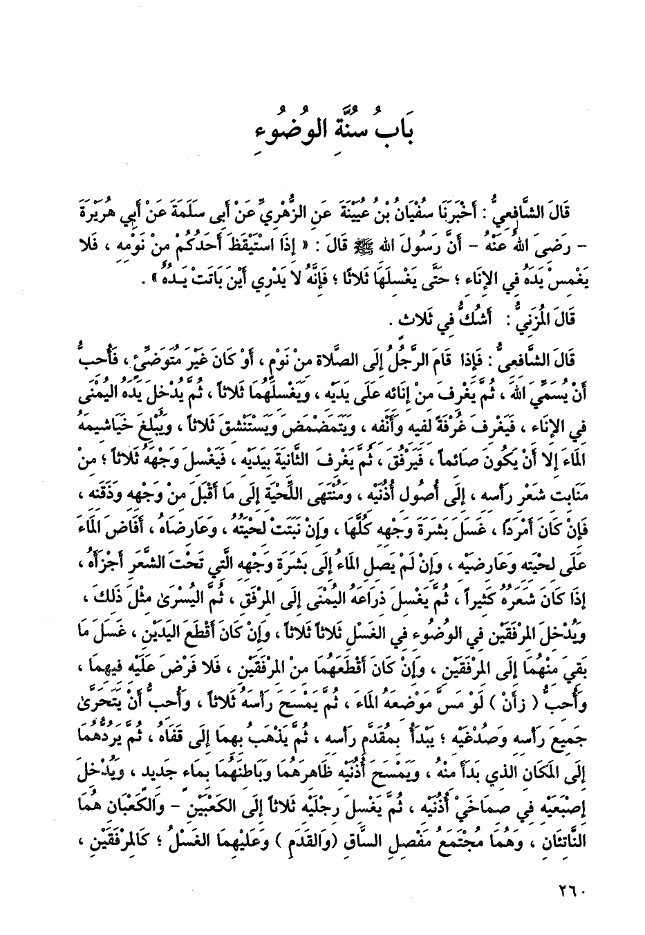 قال الشافعي: أخبرنا سفيان بن عيينة عن الزهري عن أبي سلمة عن أبي هريرة رضي الله عنه، أن رسول الله صلى الله عليه وسلم قال: إذا استيقظ أحدكم من نومه، فلا يغمس يده في الإناء، حتى يغسلها ثلاثا، فإنه لا يدري أين باتت يده.