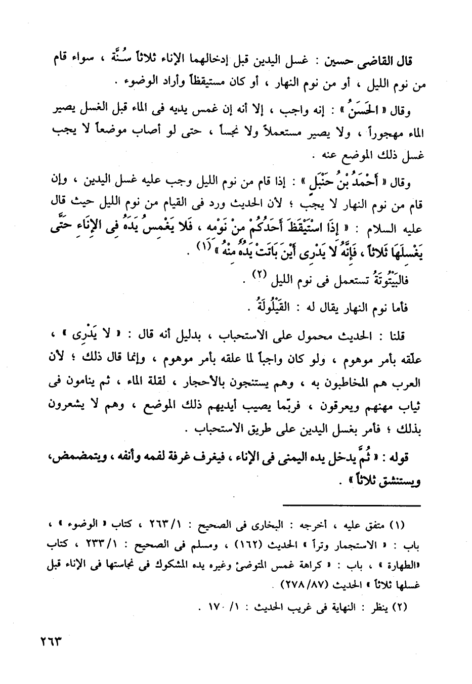 وقال أحمد بن حنبل: إذا قام من نوم الليل وجب عليه غسل اليدين، وإن قام من نوم النهار لا يجب، لأن الحديث ورد في القيام من نوم الليل حيث قال عليه السلام: (إذا استيقظ أحدكم من نومه، فلا يغمس يده في الإناء حتى يغسلها ثلاثًا، فإنه لا يدري أين باتت يده منه)