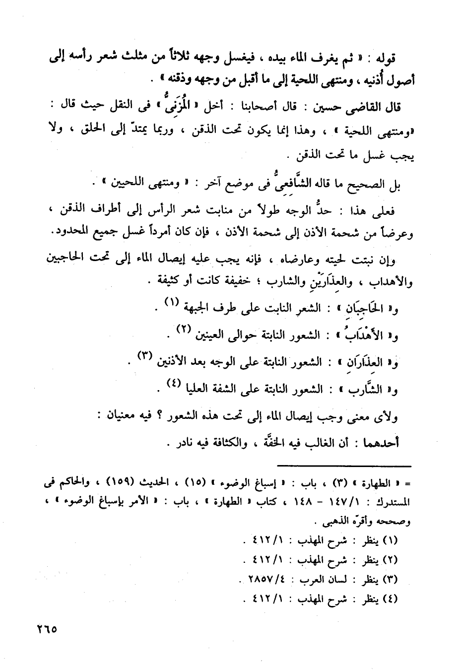 قال القاضي حسين: قال أصحابنا: أخل (المزني) في النقل حيث قال: (ومنتهى اللحية)، وهذا إنما يكون تحت الذقن، وربما يمتد إلى الحلق، ولا يجب غسل ما تحت الذقن.