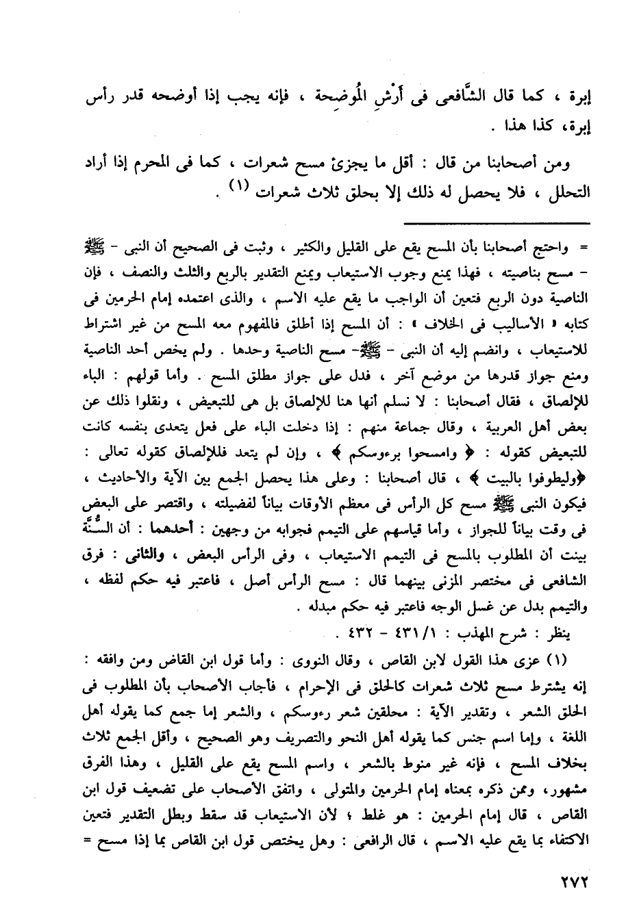 ومن أصحابنا من قال: أقل ما يجزيء مسح شعرات، كما في المحرم إذا أراد التحلل، فلا يحصل له ذلك إلا بحلق ثلاث شعرات.
