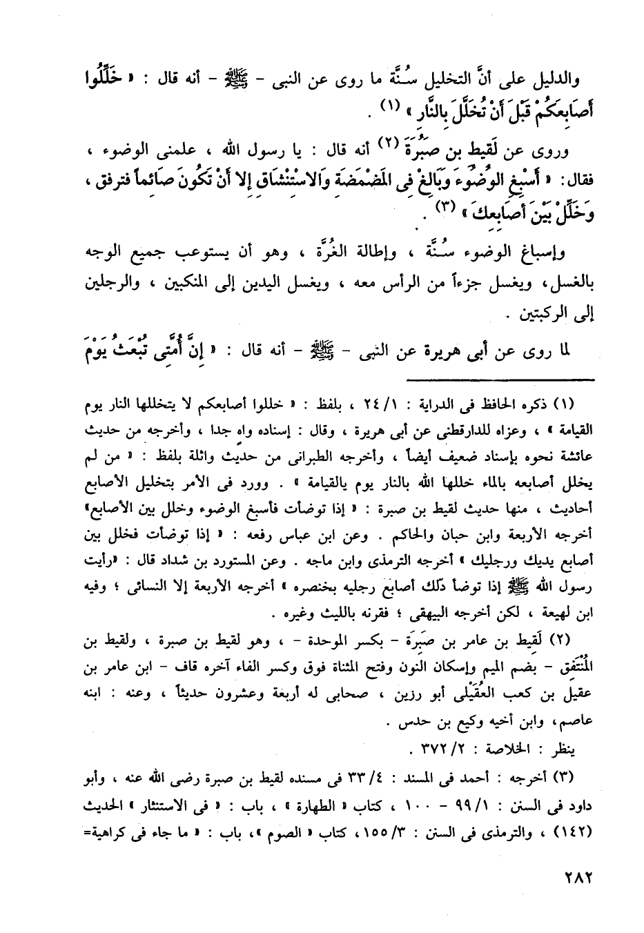 وروى عن لقيط بن صبرة، أنه قال: يا رسول الله، علمني الوضوء، فقال: أسبغ وبالغ في المضمضة والاستنشاق إلا أن تكون صائمًا فترفق، وخلل بين أصابعك.