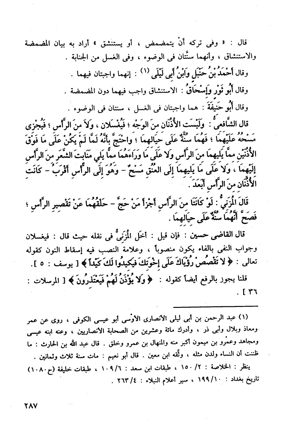قال الشافعي: وليست الأذنان من الوجه، فيغسلان، ولا من الرأس، فيجزي مسحه عليهما؛ فهما سنة على حيالهما، واحتج بأنه لما لم يكن على ما فوق الأذنين مما يليهما من الرأس ولا على ما وراءهما مما يلي منابت الشعر من الرأس إليهما، ولا على ما يليهما إلى العنق مسح- وهو إلى الرأس أقرب- كانت الأذنان من الرأس أبعد.