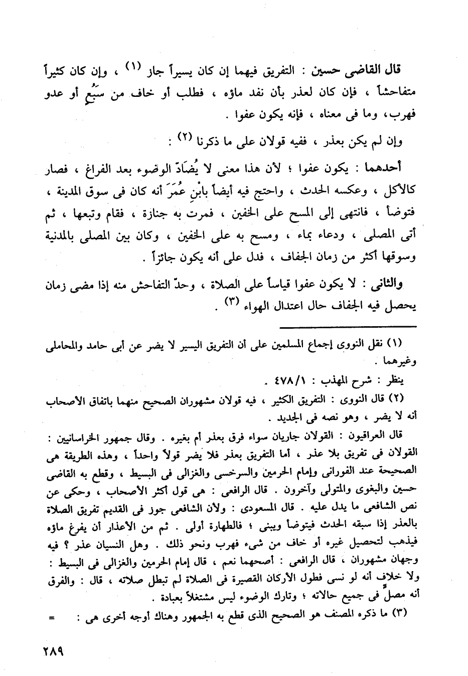 قال القاضي حسين: التفريق فيهما إن كان يسيرًا جاز، وإن كان كثيرًا متفاحشًا، فإن كان لعذر بأن نفد ماؤه، فطلب أو خاف من سبع أو عدو فهرب وما في معناه فإنه يكون عفوًا.