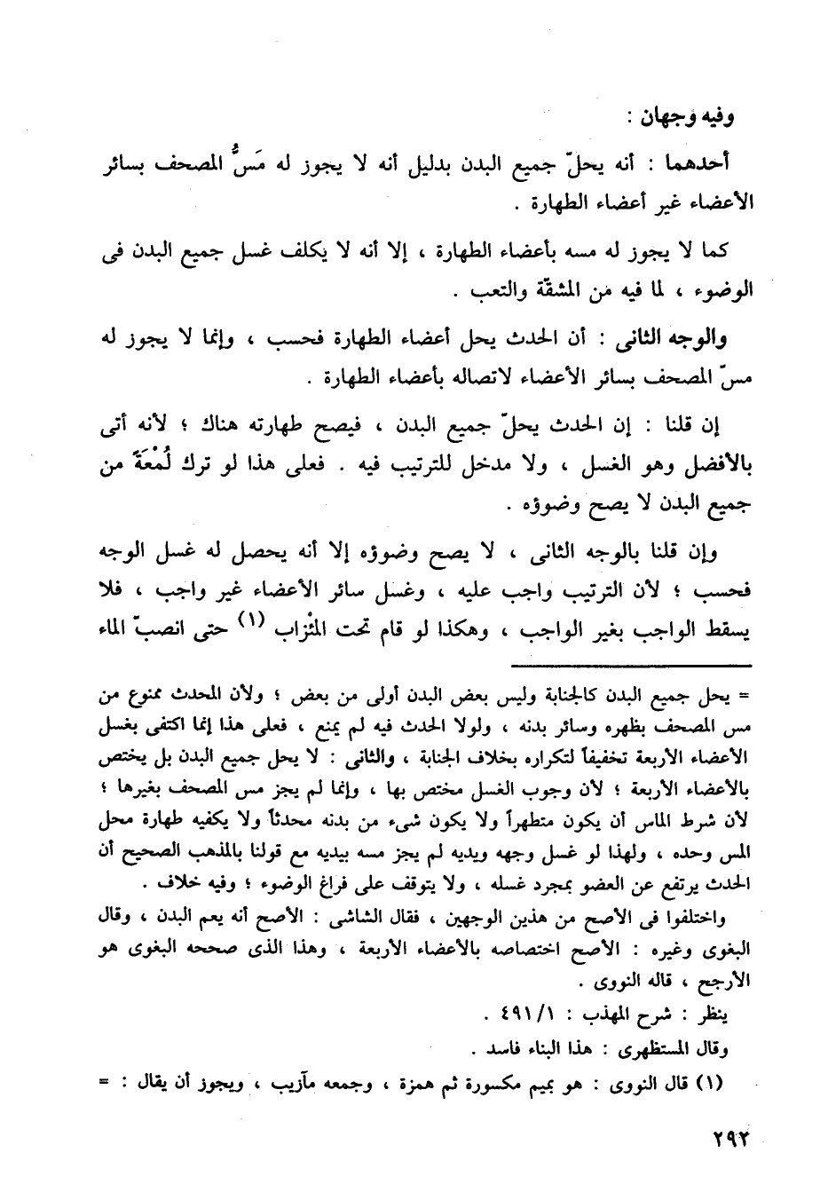 والوجه الثاني: أن الحدث يحل أعضاء الطهارة فحسب، وإنما لا يجوز له مسح المصحف بسائر الأعضاء لاتصاله بأعضاء الطهارة.