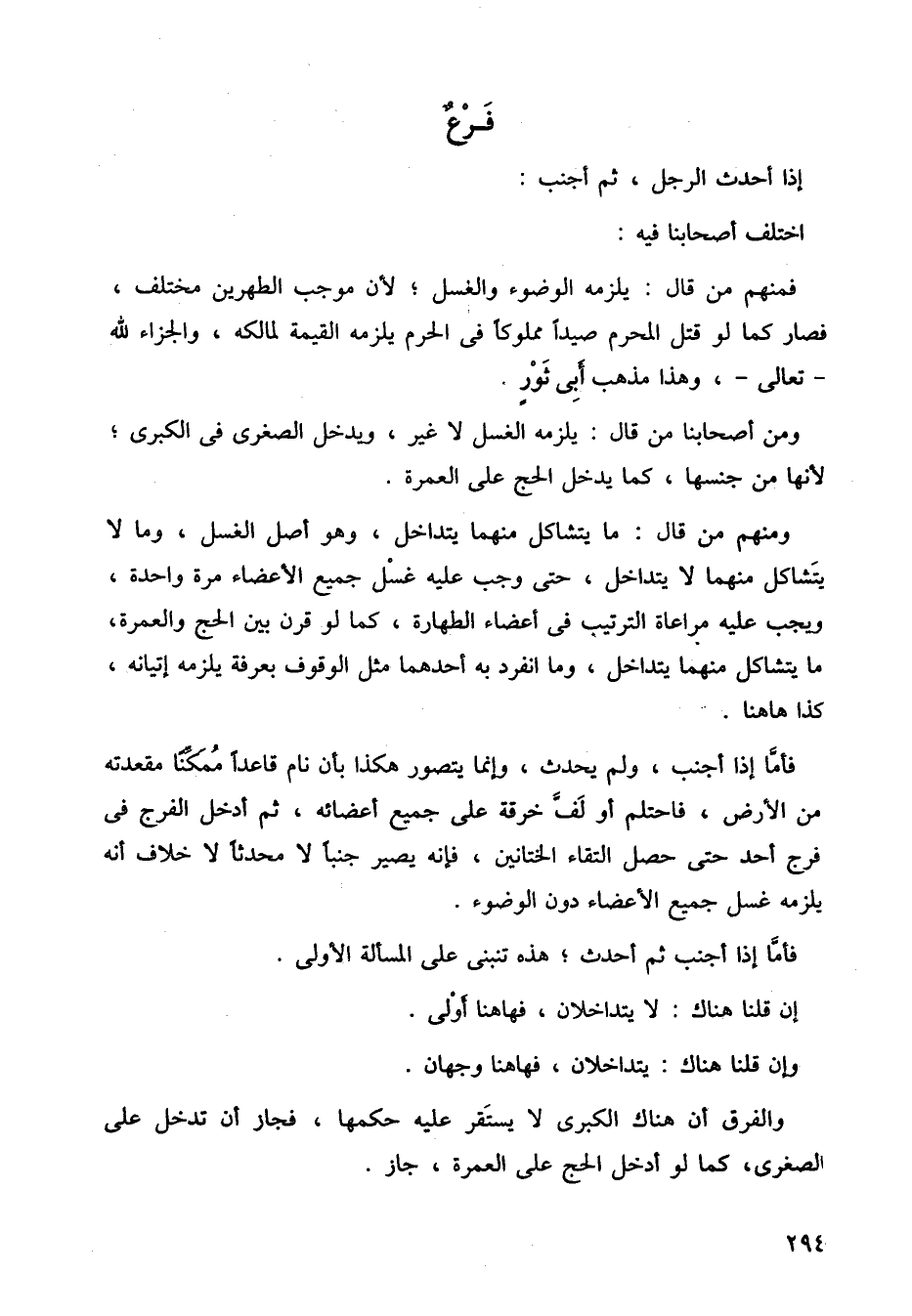 ومنهم من قال: ما يتشاكل منهما يتداخل، وهو أصل الغسل، وما لا يتشاكل مهما لا يتداخل، حتى وجب عليه غسل جميع الأعضاء مرة واحدة، ويجب عليه مراعاة الترتيب في أعضاء الطهارة، كما لو قرن بين الحج والعمرة، ما يتشاكل منهما يتداخل، وما انفرد به أحدهما مثل الوقوف بعرفة يلزمه إتيانه، كذا ها هنا.