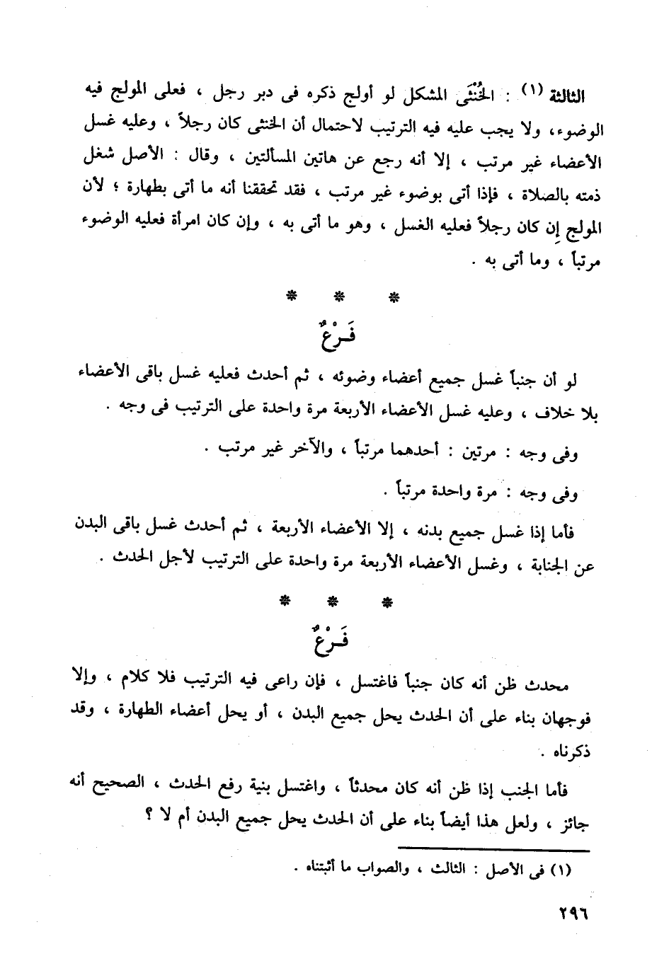 الثالثة: الخنثى المشكل لو أولج ذكره في دبر رجل، فعلى المولج فيه الوضوء، ولا يجب عليه فيه الترتيب لاحتمال أن الخنثي كان رجلاً، وعليه غسل الأعضاء غير مرتب، إلا أنه رجع عن هاتين المسألتين، وقال: الأصل شغل ذمته بالصلاة، فإذا أتى بوضوء غير مرتب، فقد تحققنا أنه ما أتي بطهارة، لأن المولج إن كان رجلا فعليه الغسل، وهو ما أتي به، وإن كان امرأة فعليه الوضوء مرتبًا، وما أتي به.