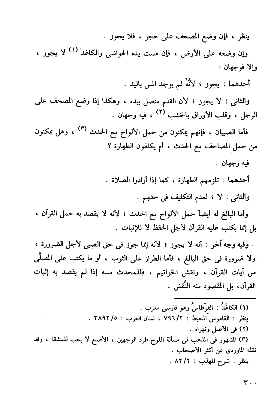 وإن وضعه على الأرض، فإن مست يده الحواشي والكاغد لا يجوز، وإلا فوجهان: