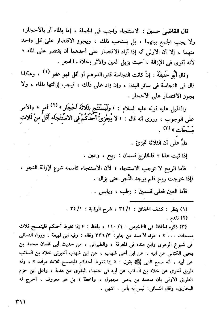 قال القاضي حسين: الاستنجاء واجب في الجملة، إما بالماء أو بالأحجار، ولا يجب الجمع بينهما، بل يستحب ذلك، ويجوز الاقتصار على كل واحد منهما، إلا أن الأولى أنه إذا أراد الاقتصار على أحدهما أن يقتصر على الماء، لأنه أقوى في الإزالة، حيث يزيل العين، والأثر بخلاف الحجر.