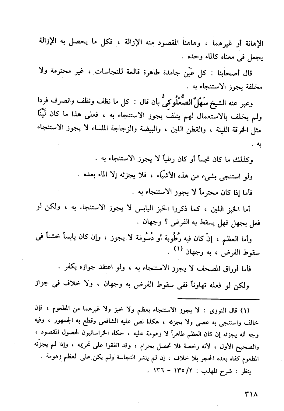 وعبر عنه الشيخ سهل الصعلوكي، بأن قال: كل ما نظف ونظف وانصرف فردا ولم يخلف بالاستعمال لهم يتلف يجوز الاستنجاء به، فعلى هذا ما كان لينا مثل الخرقة اللينة، والقطن اللين، والبيضة والزجاجة الملساء لا يجوز الاستنجاء به.