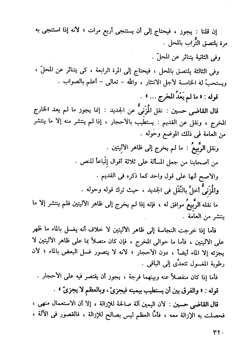 قال القاضي حسين: نقل المزني عن الجديد: إنما يجوز ما لم يعد الخارج المخرج، ونقل عن القديم، يستطيب بالأحجار، إذا لم ينتشر منه إلا ما ينتشر من العامة في ذلك الموضع وحوله.