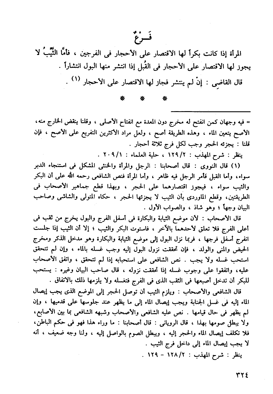 المرأة إذا كانت بكرًا لها الاقتصار على الأحجار في الفرجين، فأما الثيب لا يجوز لها الاقتصار على الأحجار في القبل إذا انتشر منها البول انتشارًا.