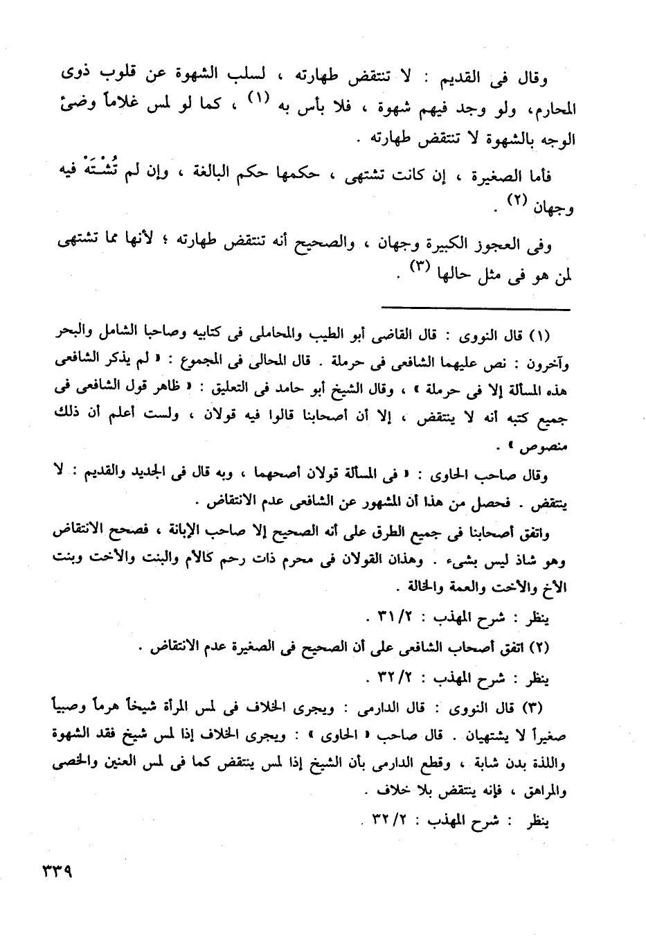 وقال في القديم: لا تنتقض طهارته، لسلب الشهوة عن قلوب ذوي المحارم، ولو وجد فيهم شهوة، فلا بأس به، كما لو لمس غلامًا، وضي الوجه بالشهوة لا تنتقض طهارته.