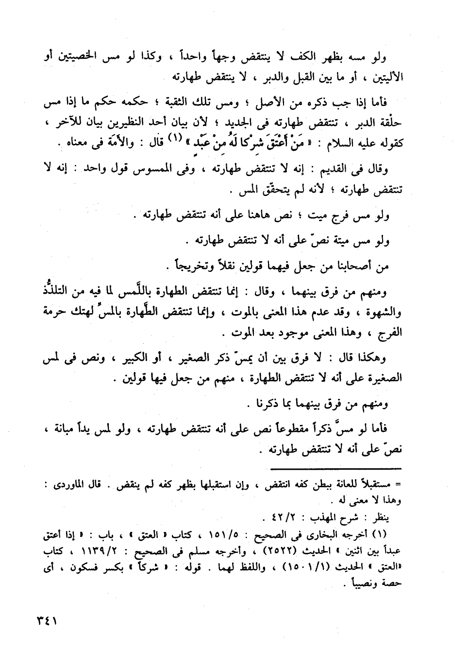 فأما إذا جب ذكره من الأصل، ومس تلك الثقبة، حكمه حكم ما إذا مس حلقة الدبر، تنتقض طهارته في الجديد، لأن بيان أحد النظيرين بيان للآخر، كقوله عليه السلام: (من أعتاق شركًا له من عبد) قال: والأمة في معناه.