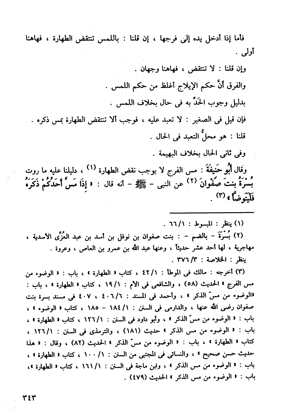 وقال أبو حنيفة: مس الفرج لا يوجب نقض الطهارة، دليلنا عليه ما روت بسرة بنت صفوان، عن النبي صلى الله عليه وسلم أنه قال: (إذا مس أحدكم ذكره فليتوضأ).