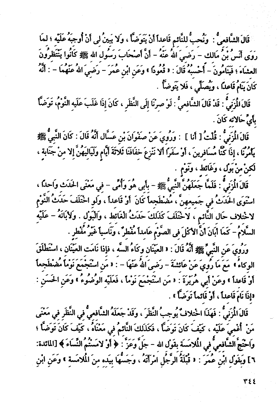 قال المزني: فهذا اختلاف يوجب النظر، وقد جعله الشافعي في النظر في معنى من أغمى عليه كيف كان توضأ، فكذلك النائم، في معناه، كيف كان توضأ، واحتج الشافعي في الملامسة، بقول الله جلا وعز (أو لامستم النساء) وبقول ابن عمر، قبلة الرجل امرأته، وجسها بيده من الملامسة، وعن ابن