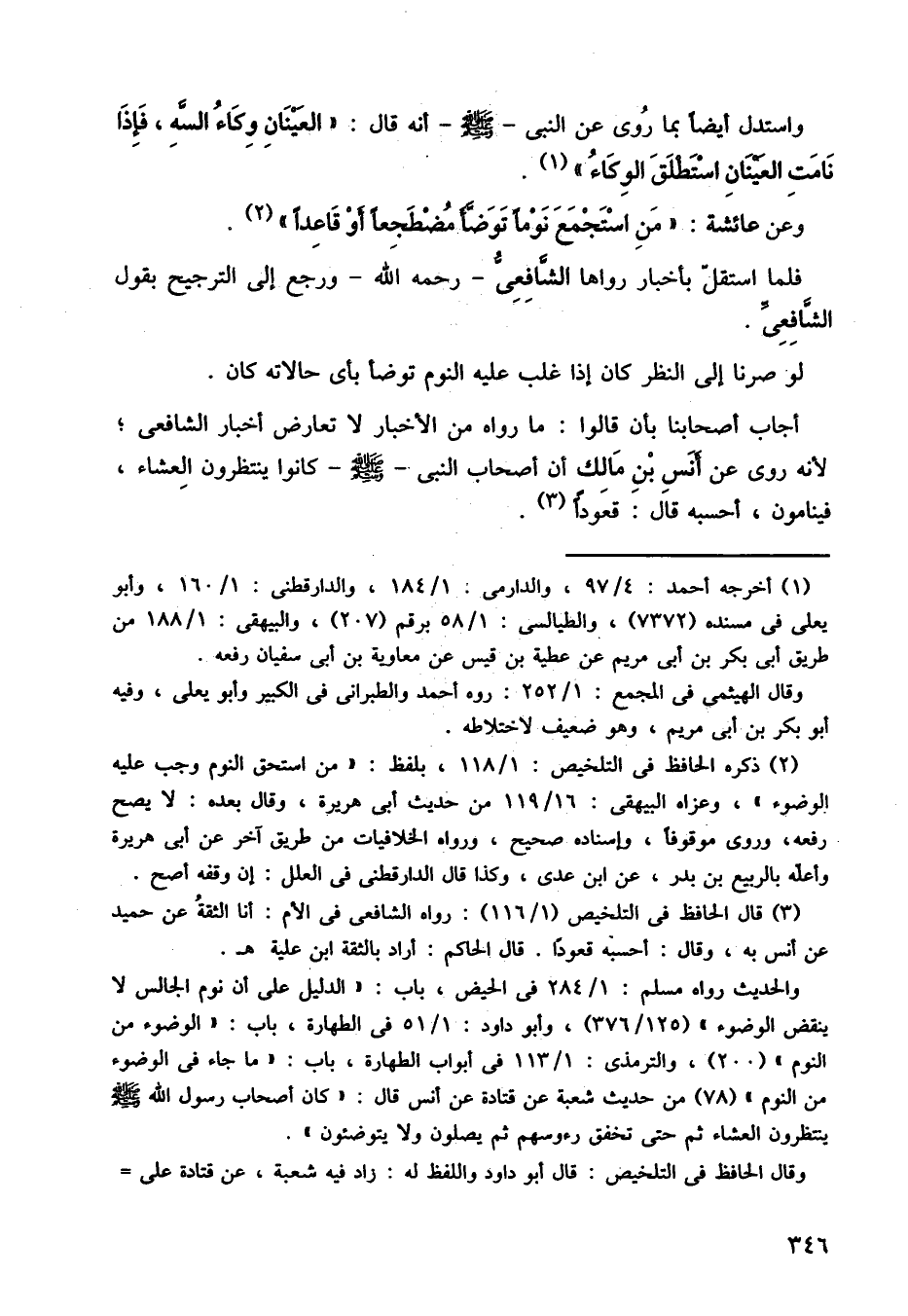 أجاب أصحابنا بأن قالوا: ما رواه من الأخبار لا تعارض أخبار الشافعي، لأنه روى عن أنس بن مالك أن أصحاب النبي صلى الله عليه وسلم كانوا ينتظرون العشاء، فينامون أحسبه قال: قعودًا.