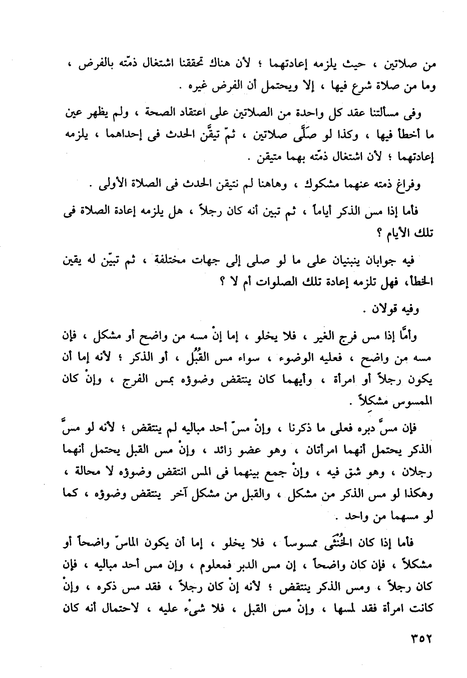 فإن مس دبره فعلى ما ذكرنا، وإن مس أحد مباليه لم ينتقض، لأنه لو مس الذكر يحتمل أنهما امرأتان، وهو عضو زائد، وإن مس القبل، يحتمل أنهما رجلان، وهو شق فيه، وإن جمع بينهما في المس انتقض وضوؤه لا محالة، وهكذا لو مس الذكر من مشكل والقبل من مشكل آخر ينتقض وضوؤه كما لو مسهما من واحد.