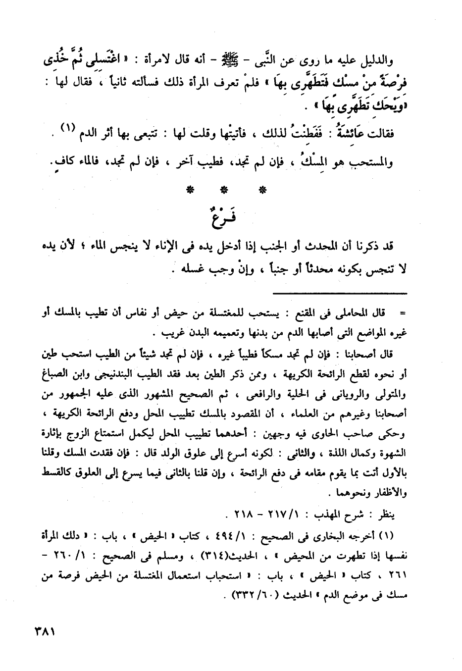 والدليل عليه ما روي عن النبي صلى الله عليه وسلم أنه قال لامرأة: اغتسلي ثم خذي فرصة من مسك فتطهري بها. فلم تعرف المرأة ذلك فسألته ثانيًا، فقال لها: ويحك تطهري بها.