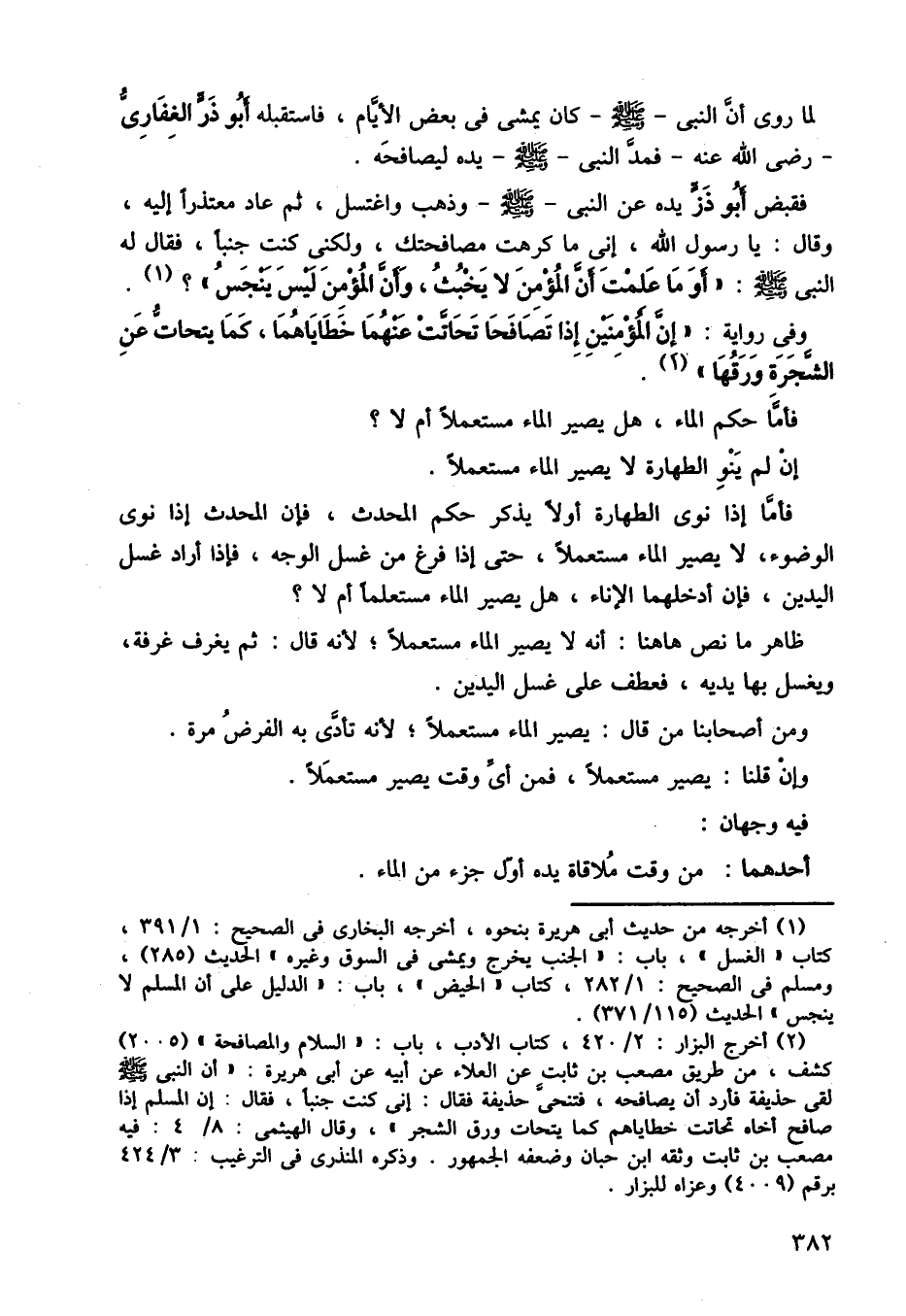 فقبض أبو ذر يده عن النبي صلى الله عليه وسلم صلى الله عليه وسلم وذهب واغتسل، ثم عاد معتذرًا إليه، وقال: يا رسول الله، إني ما كرهت مصافحتك، ولكني كنت جنبًا، فال له النبي صلى الله عليه وسلم: أو علمت أن المؤمن لا يخبث، وأن المؤمن ليس ينجس؟ وفي رواية: إن المؤمنين إذا تصافحا تحاتت عنهما خطاياهما، كما يتحات عن الشجرة ورقها.