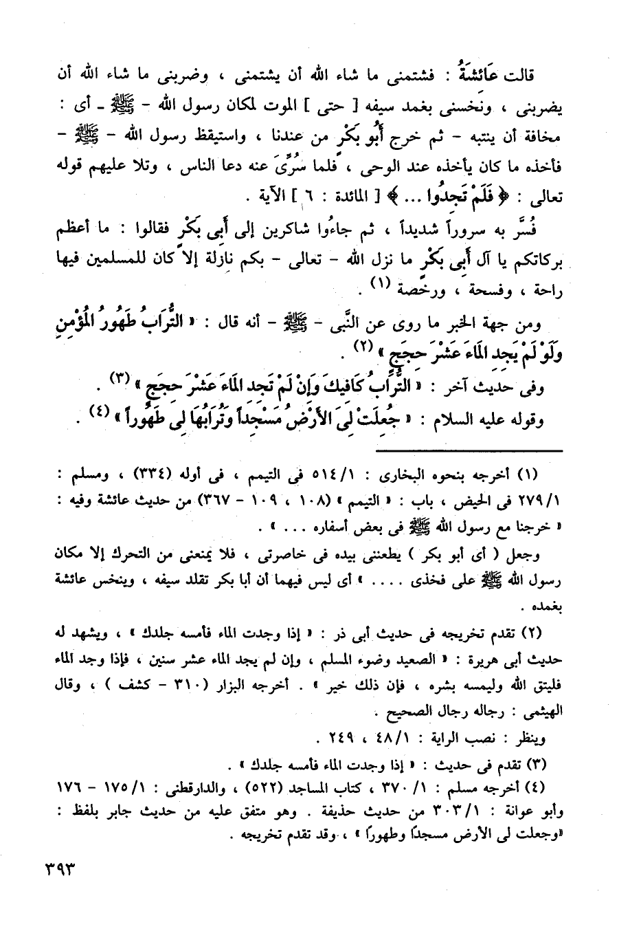 قالت عائشة: فشتمني ما شاء الله أن يشتمني، وضربني ما شاء الله أن يضربني، ونخسني بغمد سيفه [حتى] الموت لمكان رسول الله صلى الله عليه وسلم، أي مخافة أن ينتبه، ثم خرج أبو بكر من عندنا، واستيقظ رسول الله صلى الله عليه وسلم فأخذه ما كان يأخذه عند الوحي، فلما سري عنه دعا الناس، وتلا عليهم قوله: فلم تجدوا ... الآية.