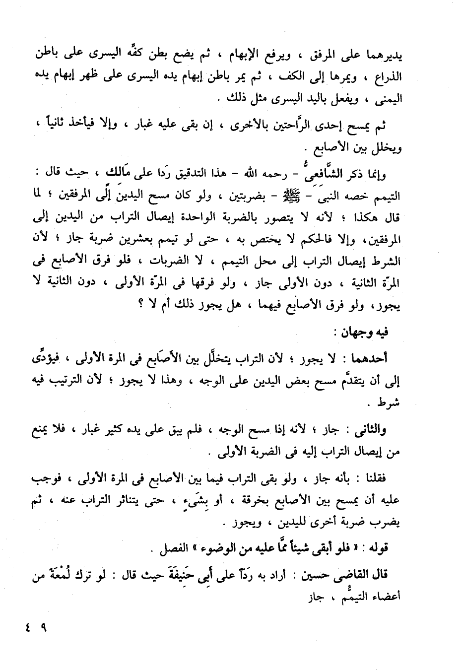 وإنما ذكر الشافعي، رحمه الله هذا التدقيق ردًا على مالك، حيث قال: التيمم خصة النبي صلى الله عليه وسلم بضربتين، ولو كان مسح اليدين إلى المرفقين، لما قال هكذا، لأنه لا يتصور بالضربة الواحدة، إيصال التراب من اليدين إلى المرفقين وإلا فالحكم لا يختص به، حت لو تيمم بعشرين ضربة جاز، لأن الشرط إيصال التراب إلى محل التيمم، لا الضربات، فلو فرق الأصابع في المرة الثانية، دون الأولى جاز، ولو فرقها في المرة الأولى، دون الثانية لا يجوز، ولو فرق الأصابع فيهما، هل يجوز ذلك أم لا؟