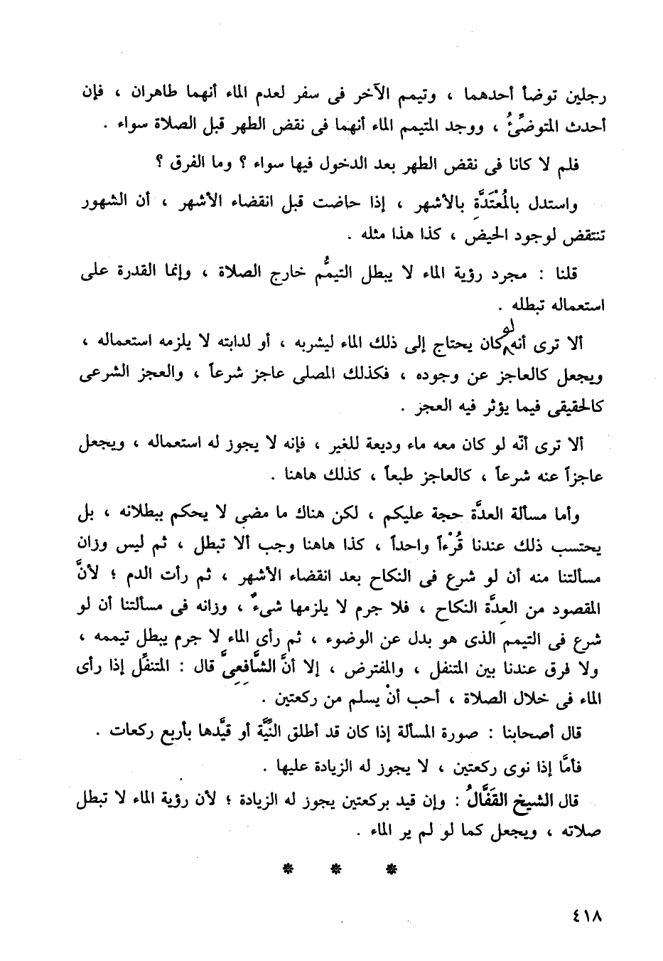 وأما مسألة العدة حجة عليكم، لكن هناك ما مضى لا يحكم ببطلانه، بل يحتسب ذلك عندنا قرءا واحدًا، كذا ها هنا، وجب ألا تبطل، ثم ليس وزان مسألتنا منه أن لو شرع في النكاح بعد انقضاء الأشهر، ثم رأت الدم، لأن المقصود من العدة النكاح، فلا جرم لا يلزمها شيء، وزانه في مسألتنا أن لو شرع في التيمم الذي هو بدل عن الوضوء، ثم رأي الماء لا جرم يبطل تيممه، ولا فرق عندنا بين المتنفل، والمفترض، إلا أن الشافعي قال: المتنفل إذا رأي الماء في خلال الصلاة، أحب أن يسلم من ركعتين.