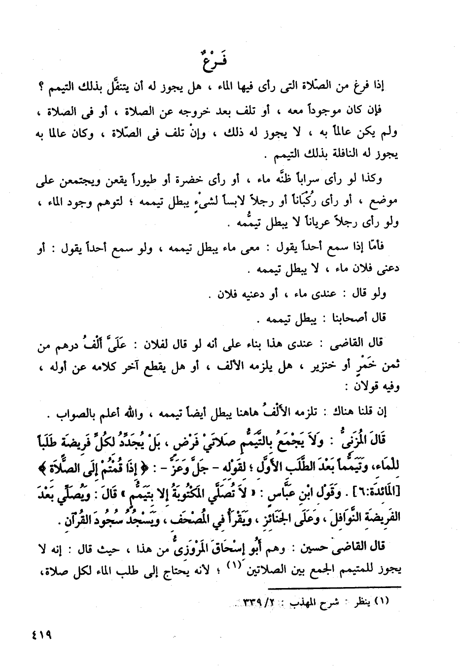 إذا فرغ من الصلاة التي رأي فيها الماء، هل يجوز له أن يتنفل بذلك التيمم؟ فإن كان موجودًا معه، أو تلف بعد خروجه عن الصلاة، أو في الصلاة، ولم يكن عالمًا به، لا يجوز له ذلك، وإن تلف في الصلاة، وكان عالمًا به يجوز له النافلة بذلك التيمم.